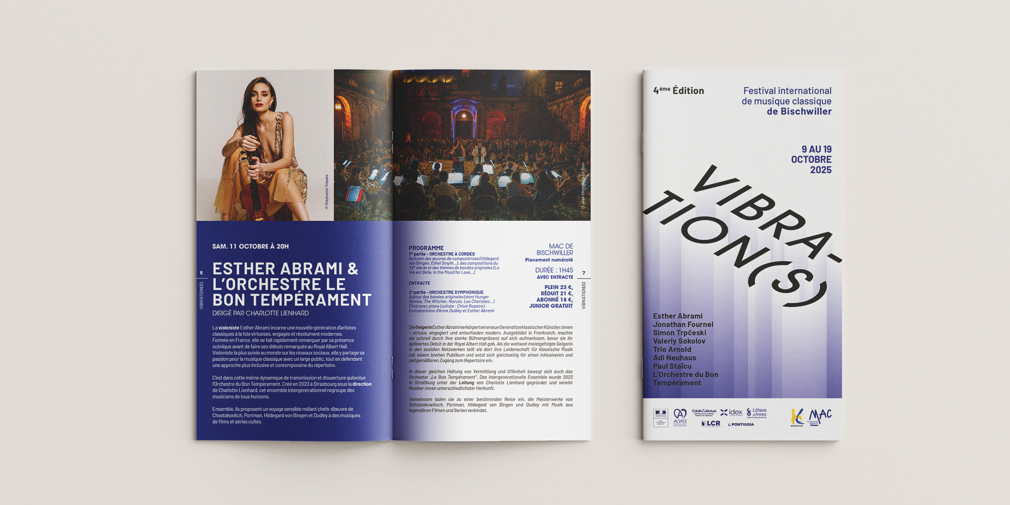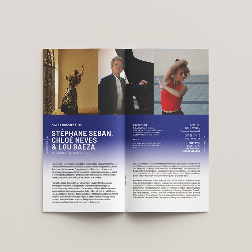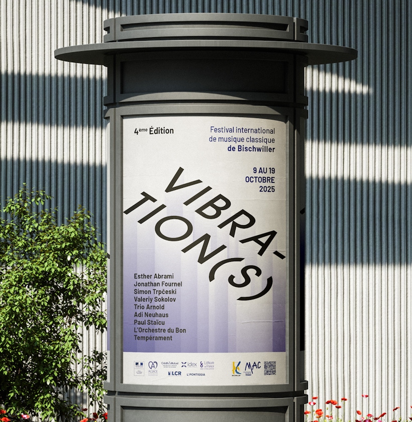 Porté par la Ville de Bischwiller et la MAC, le festival VIBRATION(S) fait vibrer chaque automne la musique classique dans toute sa richesse. Sa direction artistique épurée et élégante est à l’image de sa programmation diverse et internationale. Chaque année, l’objectif est de faire évoluer le concept des « vibrations » et de revisiter la mise en page et l’aspect graphique de la campagne de communication.