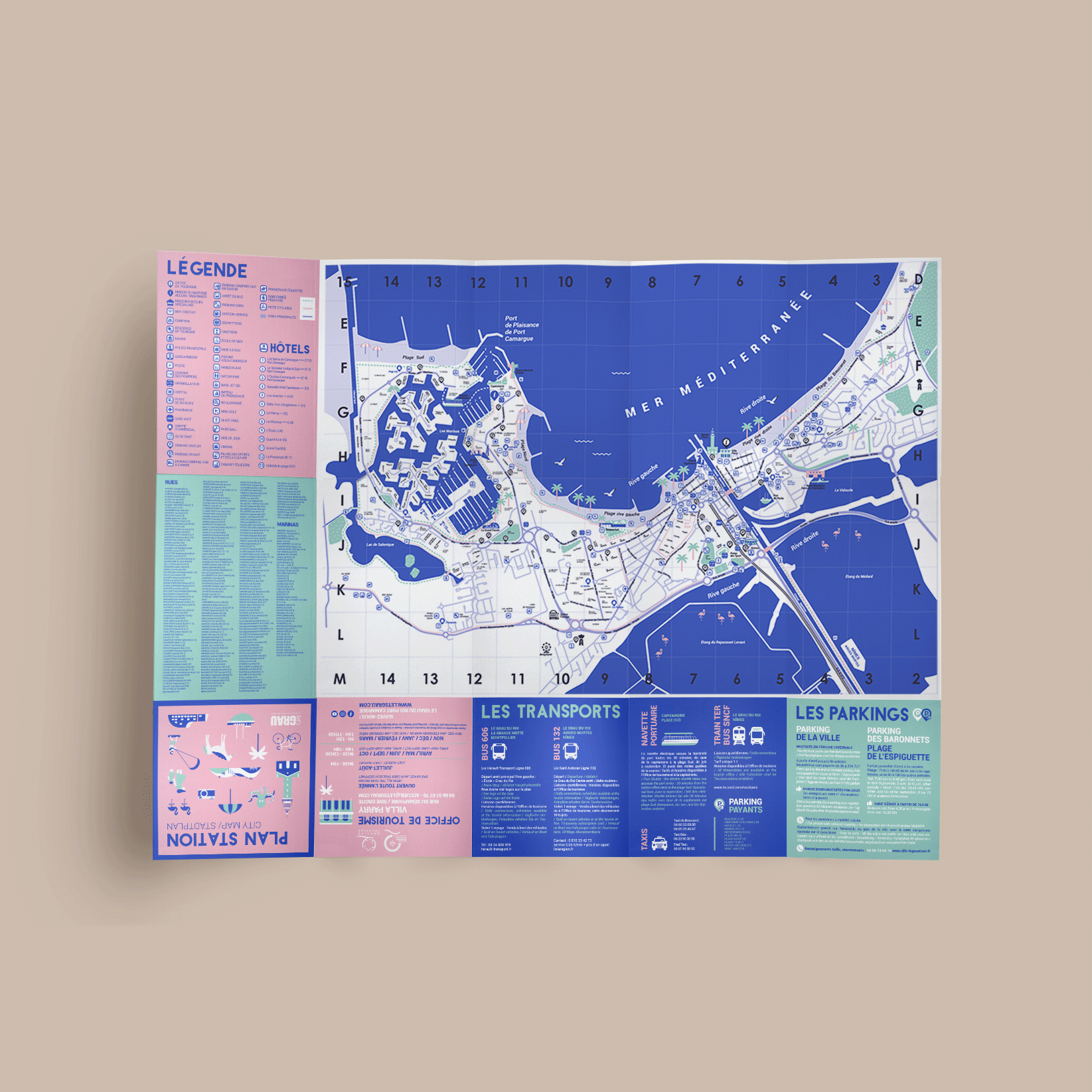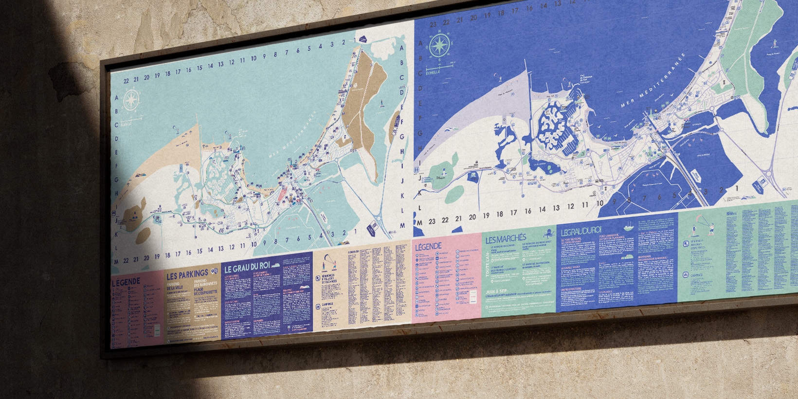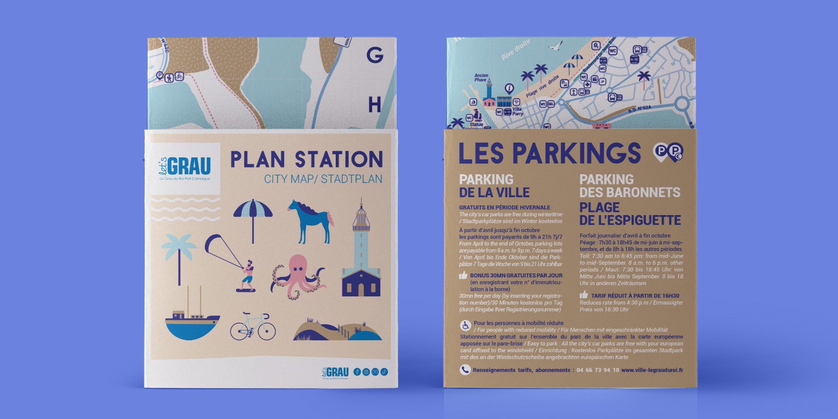 L’Office de Tourisme du Grau-du-Roi nous a confié la réalisation d’une carte simplifiée de la ville et de ses principaux attraits touristiques. Nous avons opté pour un code couleur frais et estival, des pictogrammes et illustrations en flat design contemporain, ainsi qu’une mise en page claire et structurée, pensée pour une lisibilité optimale.