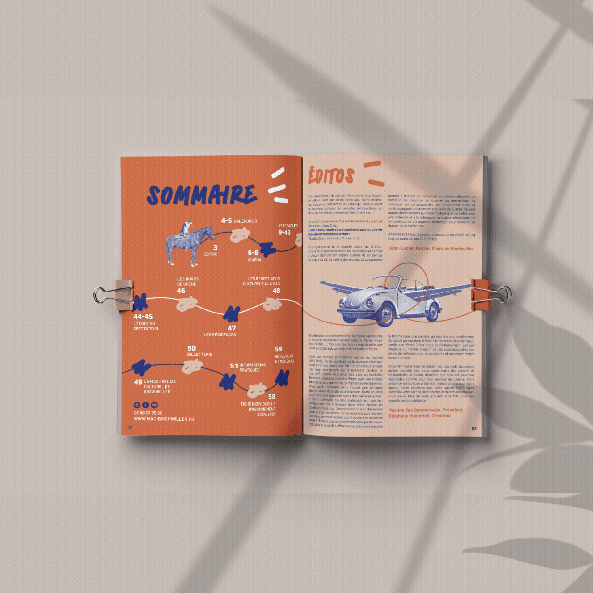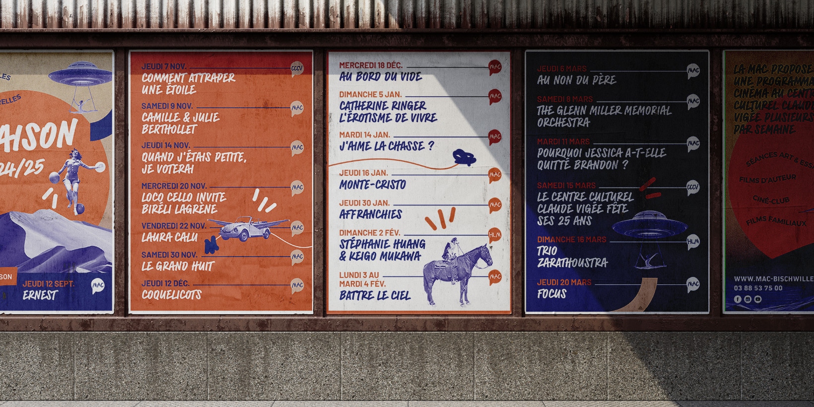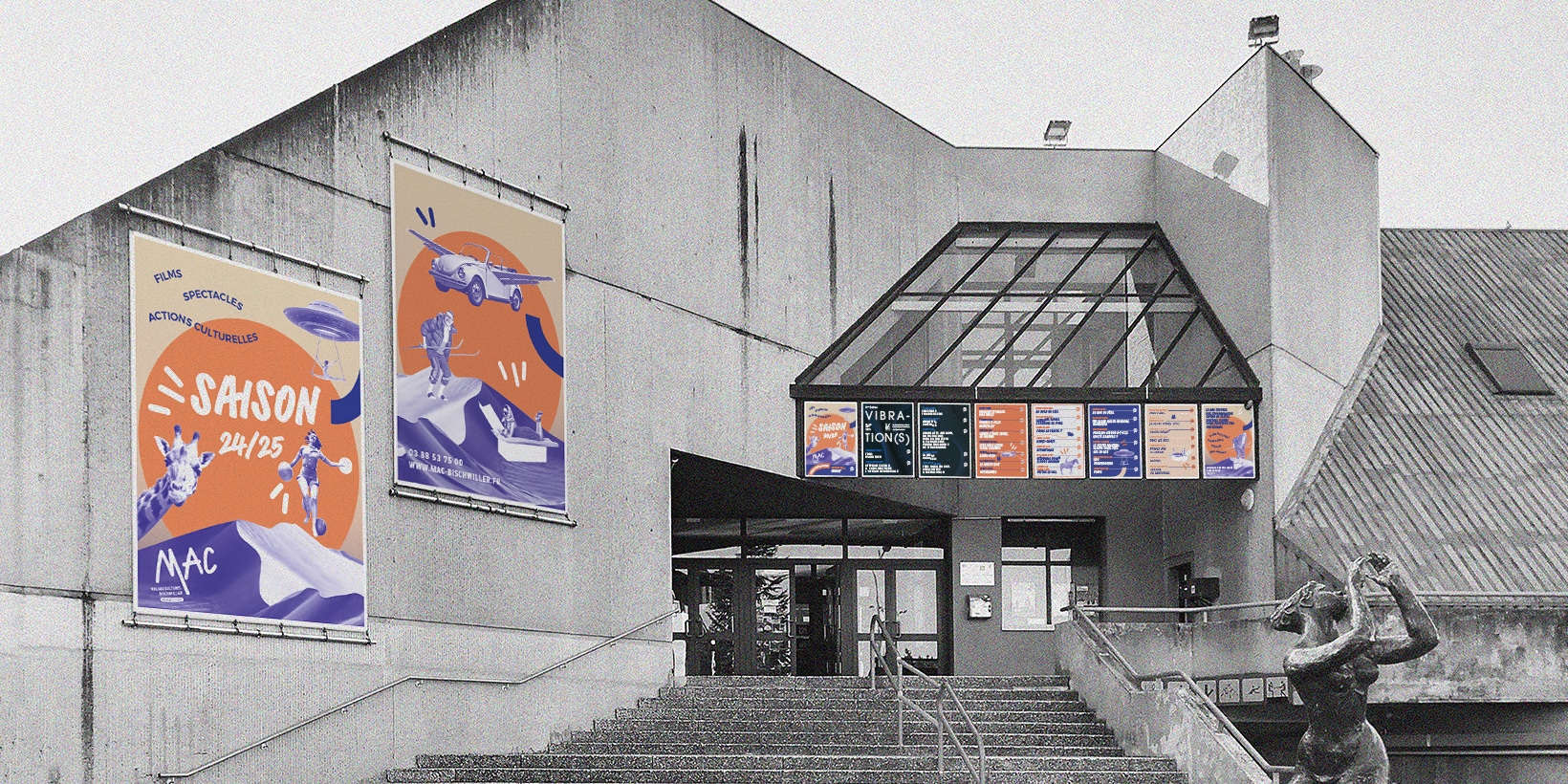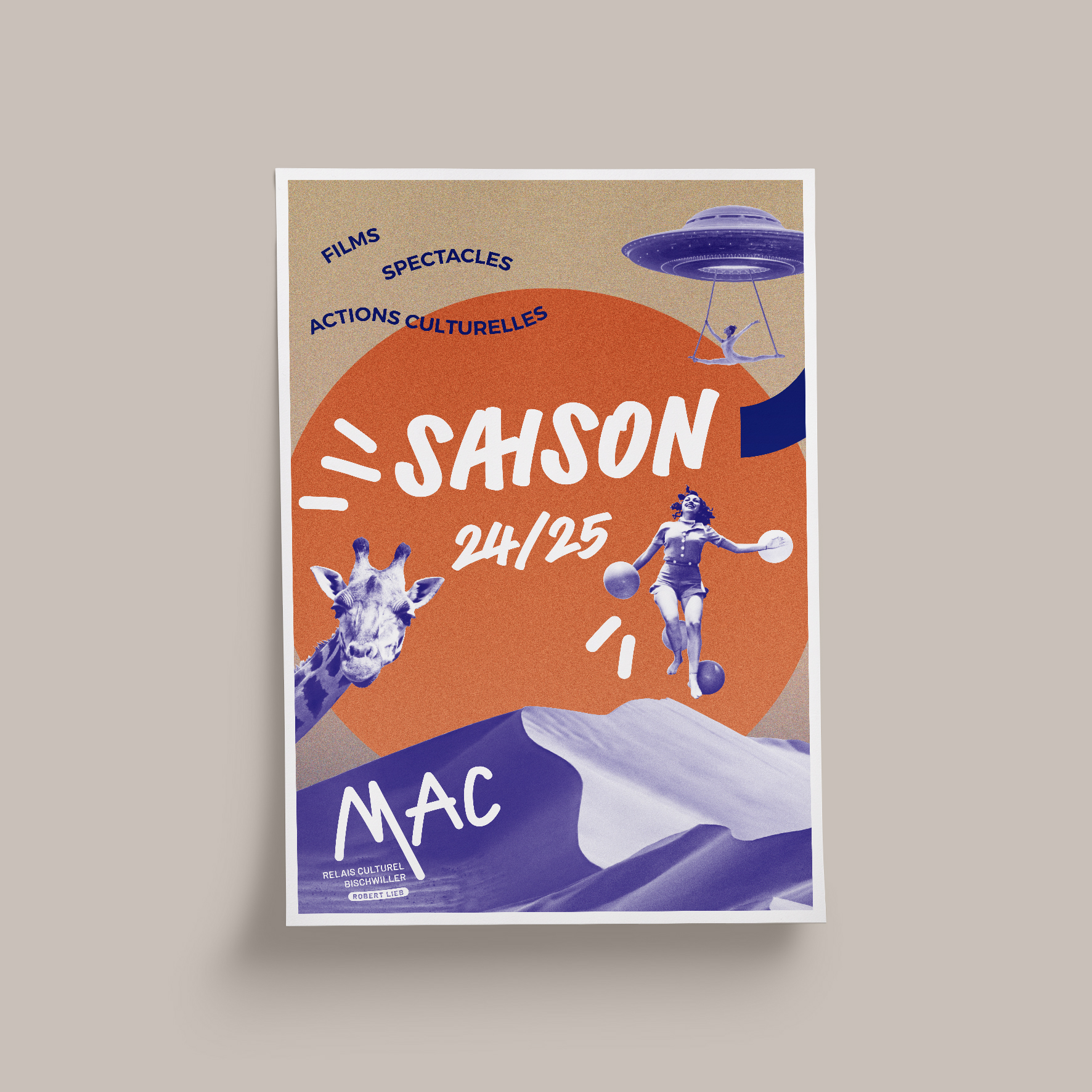 Nous accompagnons avec enthousiasme la MAC Relais culturel de Bischwiller depuis 5 ans dans la création de son visuel de saison et l’ensemble de sa communication graphique annuelle. Une collaboration au service d’une programmation varié et engagée. Chaque saison est l’occasion de renouveler un univers visuel en résonance avec l'identité de la MAC et les attentes de son public.
