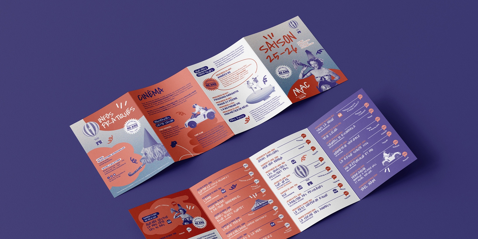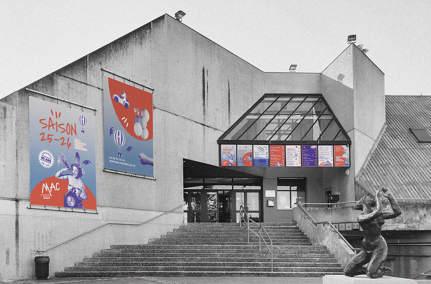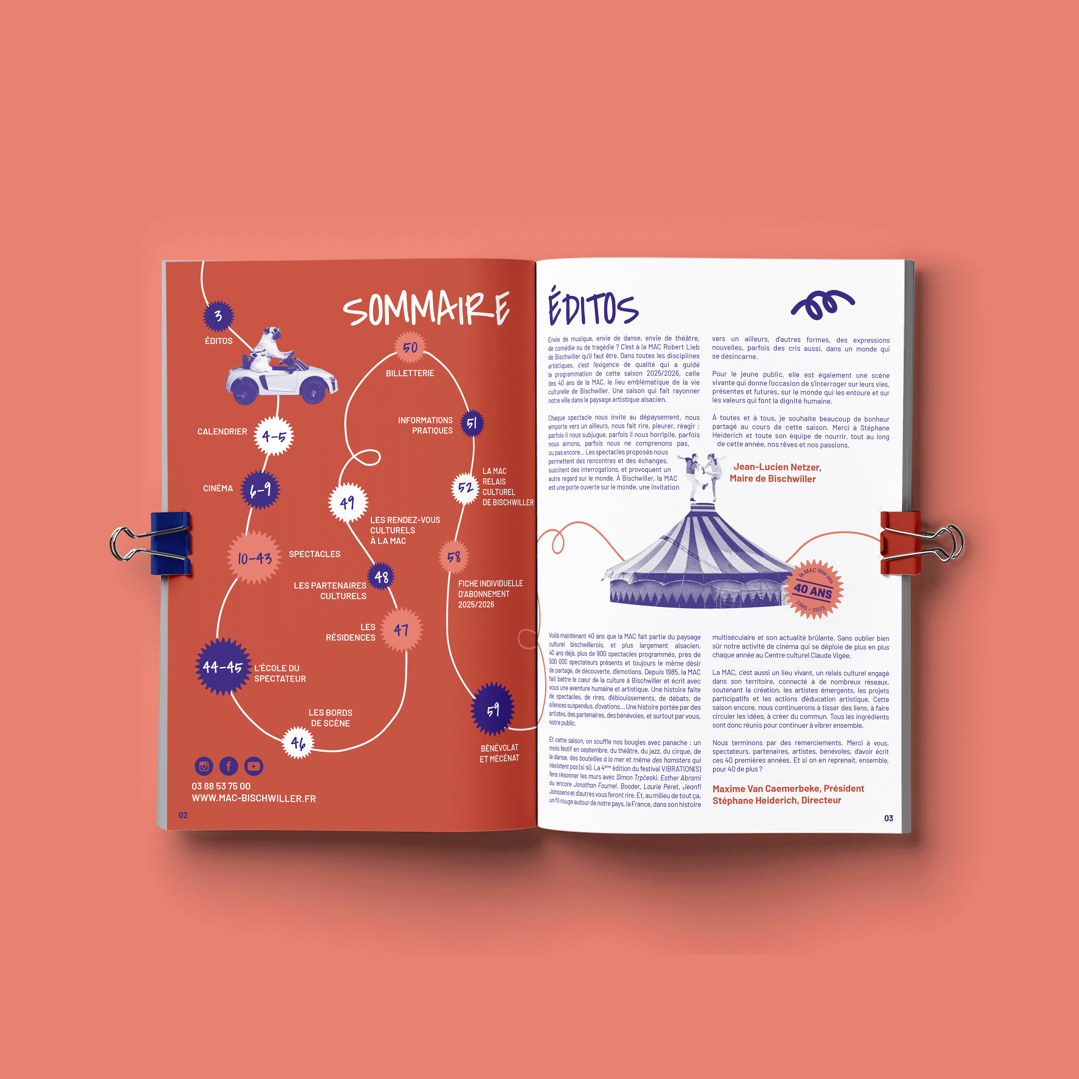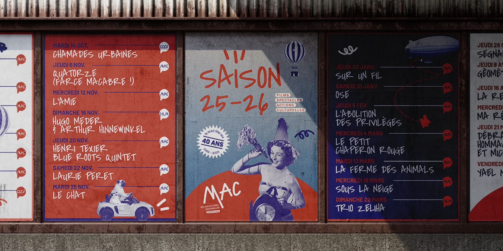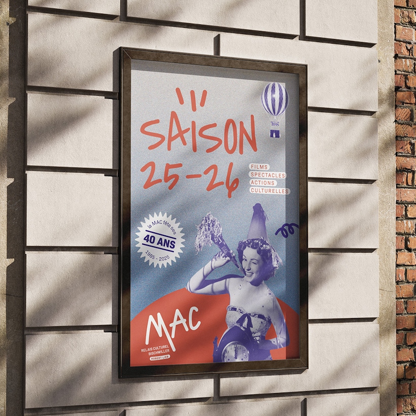 Nous accompagnons avec enthousiasme la MAC Relais culturel de Bischwiller depuis 5 ans dans la création de son visuel de saison et l’ensemble de sa communication graphique annuelle. Une collaboration au service d’une programmation varié et engagée. Chaque saison est l’occasion de renouveler un univers visuel en résonance avec l'identité de la MAC et les attentes de son public.