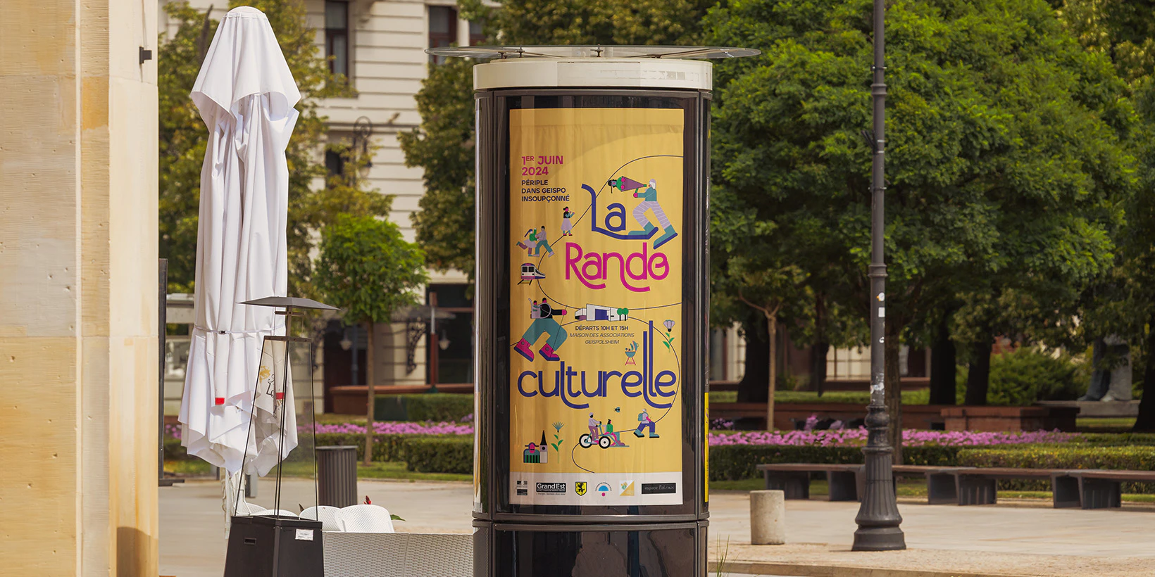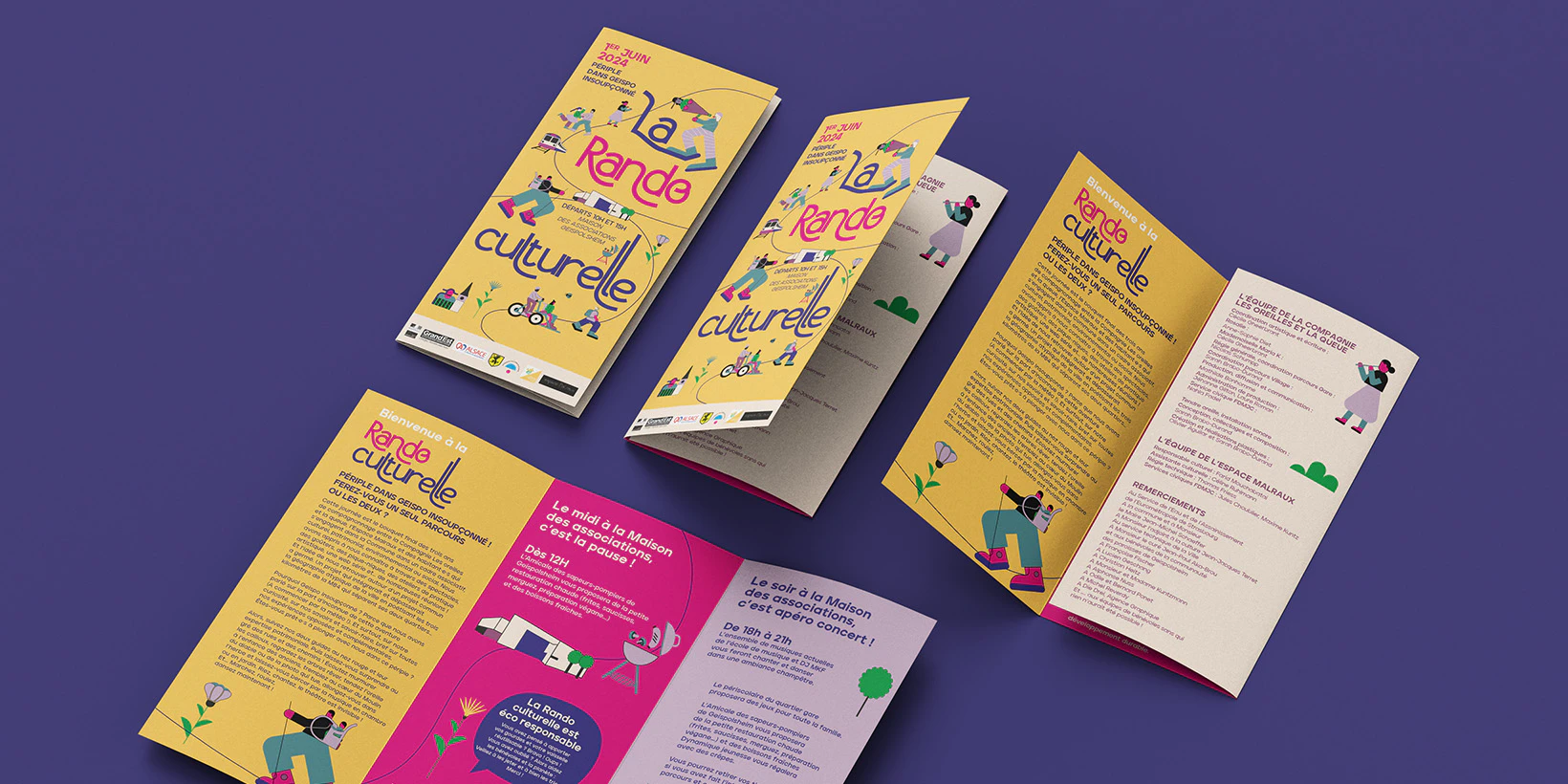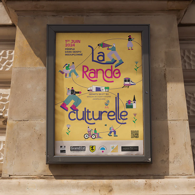 Réalisée pour la Compagnie les Oreilles et la Queue en 2024, la Rando Culturelle combine sport, expression artistique et découverte du patrimoine local. La direction artistique cherche à mettre en avant la diversité du public et ses interactions dans un environnement naturel et riche. Elle a été déclinée en affiche, flyer, brochure d'itinéraire et autocollants pour étoffer la communication.