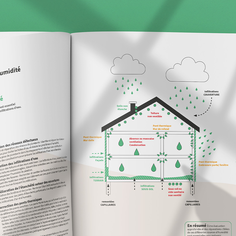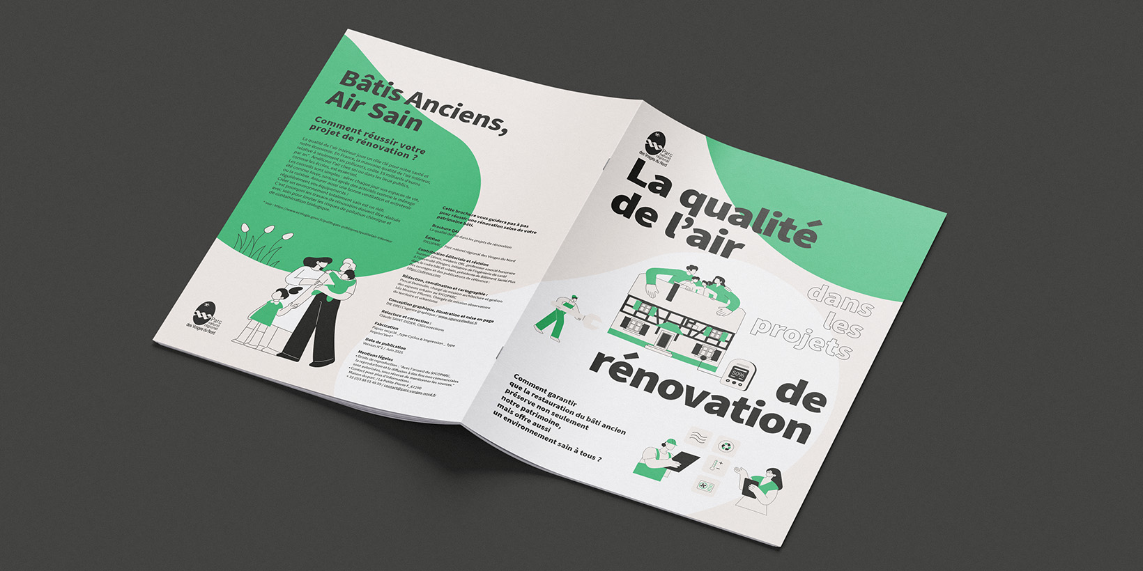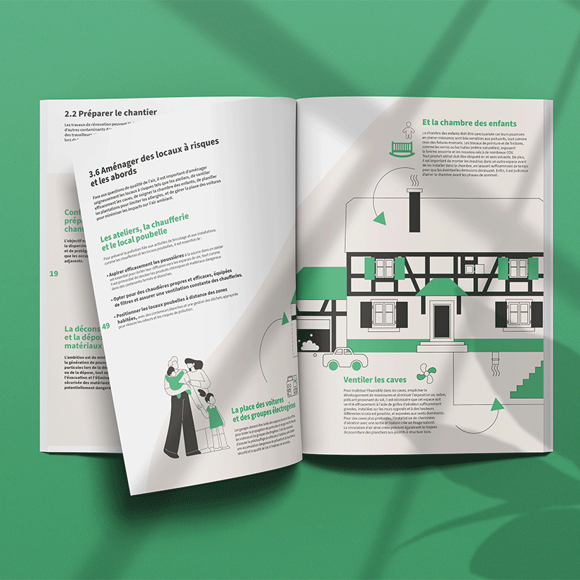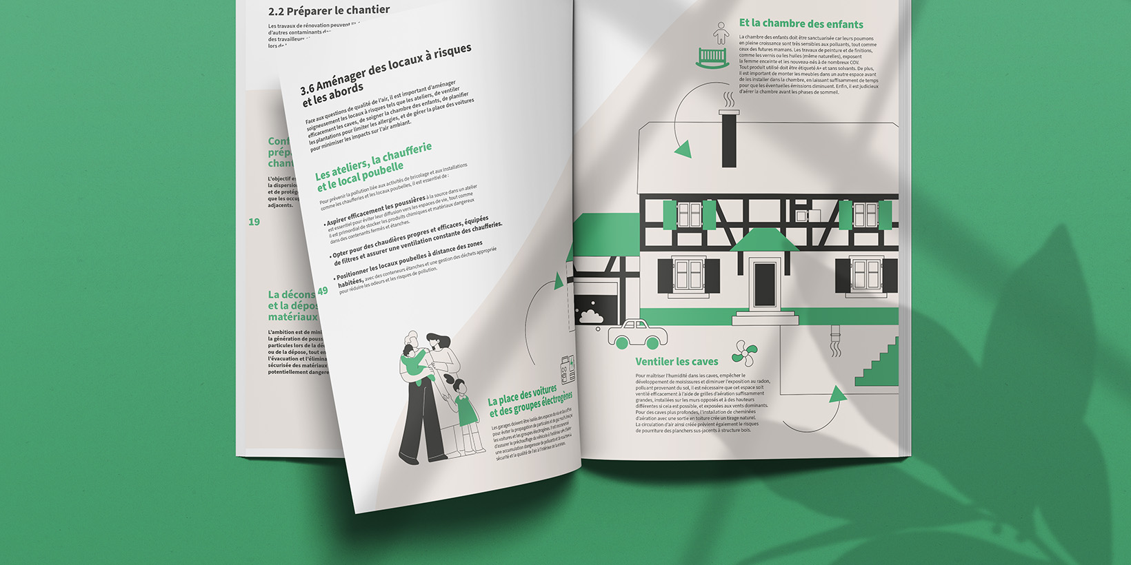 Depuis 2019, nous avons eu divers projets de communication visuelle avec le Parc naturel régional des Vosges du Nord. La brochure "La qualité de l'air dans les projets de rénovation" lie visuels infographiques et illustratifs à une mise en page épurée pour la lisibilité des informations.