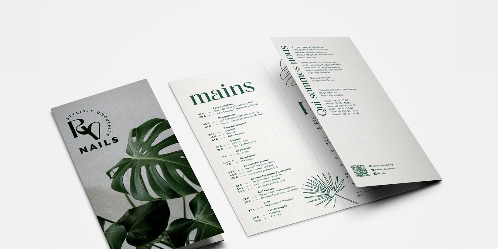 Pour RV Nails, nous avons conçu une nouvelle identité graphique qui lie le naturel et de moderne. Le logo repensé, la typographie contemporaine et la mise en page épurée allient lisibilité et esthétisme, dans un univers végétal élégant qui conjugue expertise et sens du détail, à l’image du créateur des salons.