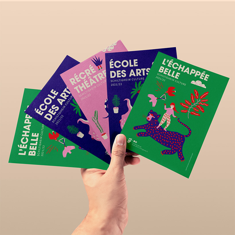 Pendant trois années, nous avons accompagné la Ville de Schiltigheim dans la création graphique des visuels de saison. À travers un travail illustratif, nous avons exploré des univers visuels décalés et riches en couleurs. Chaque édition a été l’occasion de proposer un style graphique inédit, en renouvelant sans cesse les codes et les ambiances.